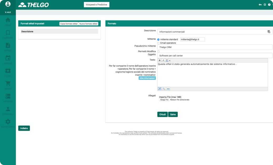 Cliccando su “nuovo formato email” verrà visualizzato un form dove è possibile creare un email che verrà messa a disposizione dell’operatore:
